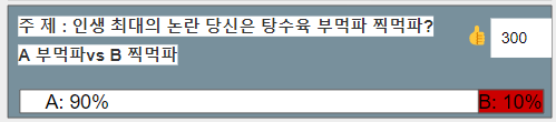 백분율 구하는 식을 만들어서 부먹파(백분율), 찍먹파(백분율) 이라 는 변수에 각각 넣어주면 되겠다.